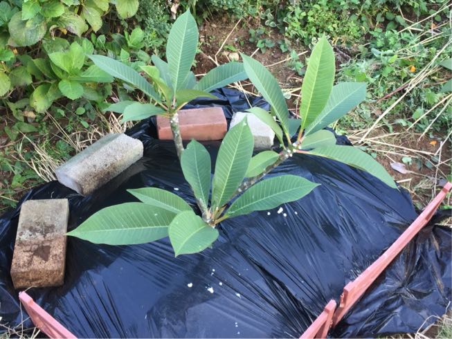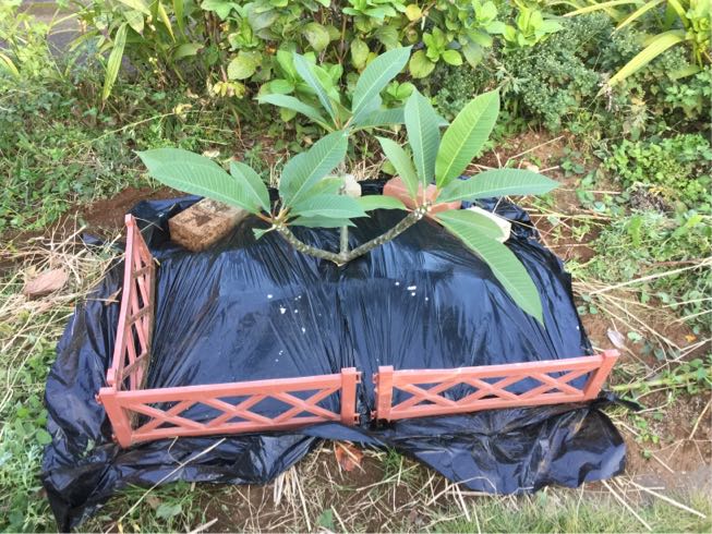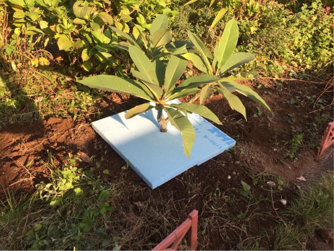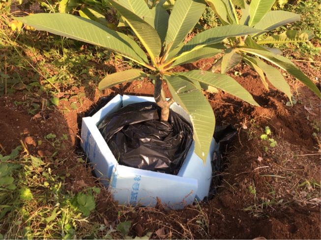 プルメリアは冬は休眠するのですが、地植えだと雨水が流れ込んでしまうので少しでも地面の湿気から隔離するために、一旦周りを掘り起こし園芸用マルチシートで根元周りをぐるっと囲って隔離しました。