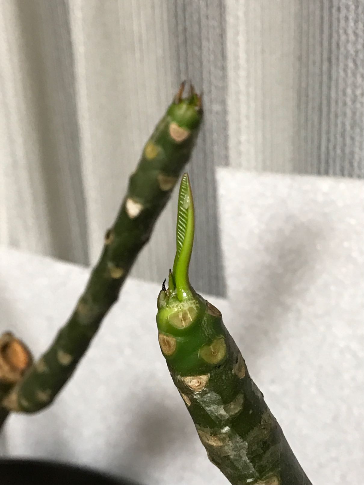昨年気温が下がって室内で冬眠させていたプルメリアがやっと目を覚まし始めました。