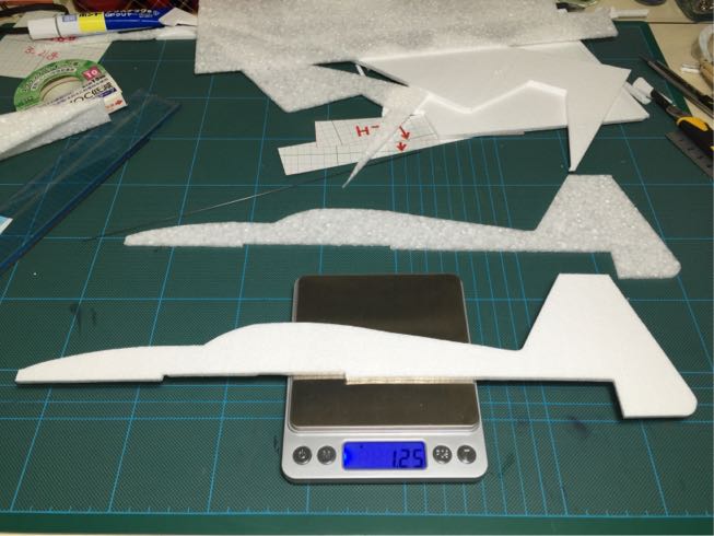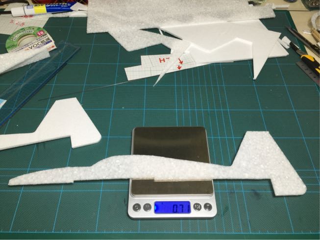 GFRの完成重量は厚めの発泡スライスを使っていてかなり重くなってしまったので、新型機は強度とバランスをとりながらなるべく軽量化を意識して作ろうと思いEPPの使用も最低限にしようかと思っていたのですが、試しに発泡とEPPと両方切り出して計量してみたら