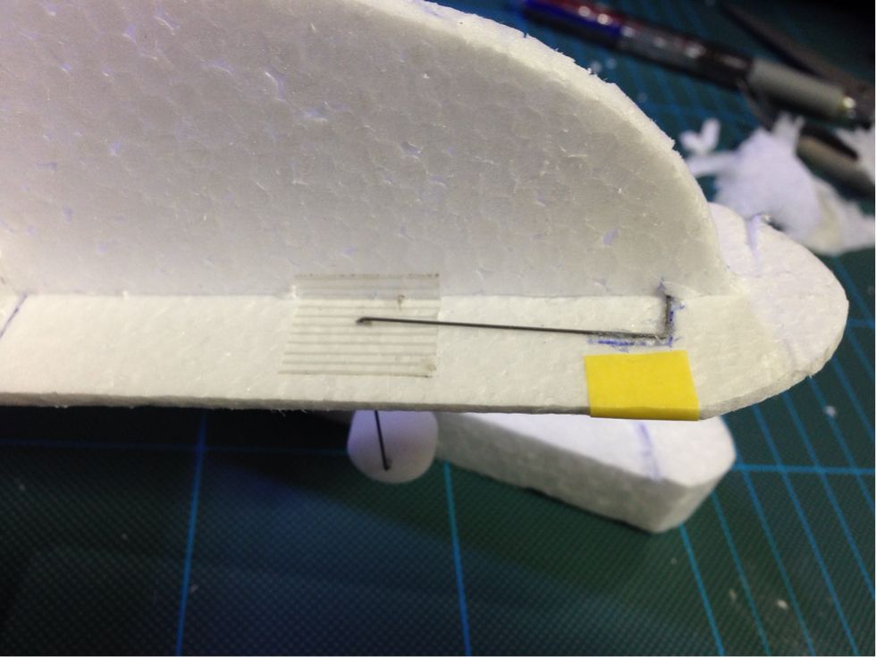 主翼はカーボンのかんざしを介して左右接着。内側の上反角はゼロで、かんざしの両端から先だけ上反角をセット