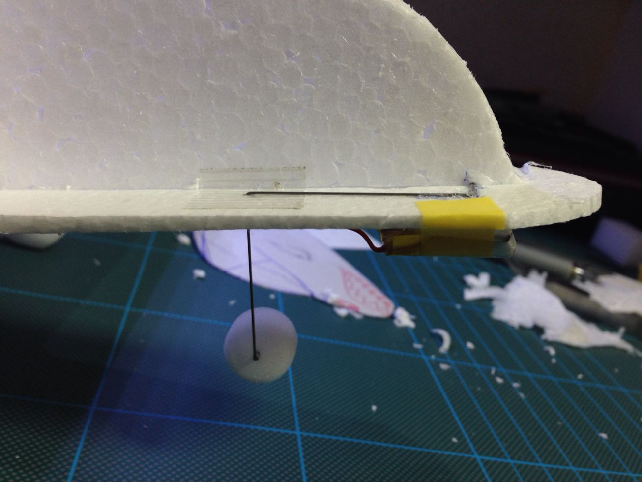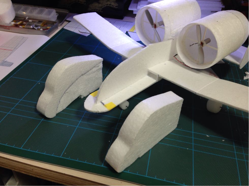 そこで、どうせ重たくするなら補強で重くした方がい〜やと、機首は中身をくり抜かない無垢の発泡スチロールで作ることにしました