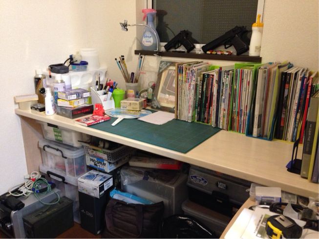 念願の趣味部屋は一坪と広くはないですが、今まで寝室の片隅でベッドに発泡スチロールの粉を撒き散らしながらやっていたのと比べれば、かなりの贅沢かもしれません(^^;;