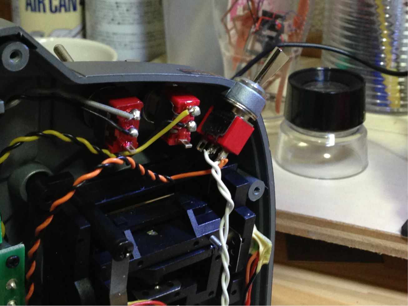 トリガーの信号をラダーからとっていましたが、ラダー操作と一緒にスロットルも動かしてしまうので(ただ単に操縦が下手なだけ)ギヤSWと並行に押しボタンSWを割り込ませて見ました。