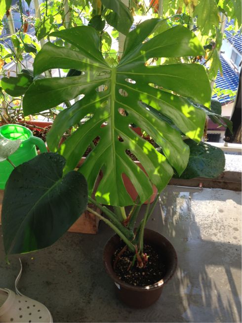 それと変わって、株わけを繰り返しながら5年目くらいになるモンステラは栄養剤の大量投入のせいか、今までになくデカイ葉っぱが生えて来ました